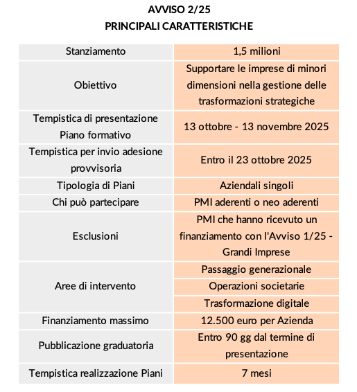 L’Avviso è rivolto esclusivamente alle PMI aderenti e neo-aderenti al Fondo, con l’eccezione di quelle che hanno già beneficiato di un finanziamento tramite l’Avviso 1/2025. Ogni azienda potrà presentare un solo Piano formativo, in forma singola, richiedendo un finanziamento massimo di 12.500 euro.